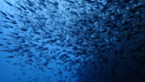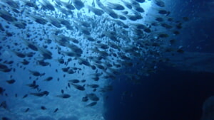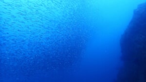 アーチを抜けて顔を上げると、海面を覆い尽くすキビナゴにカンパチが猛烈にアタック。