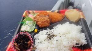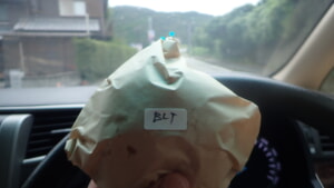 運転しながら片手で食べるのは大変危険です、皆さんはやめておきましょう。