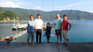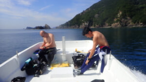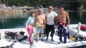 今回はOWの海洋実習生が2名、マリンランドを惜しむFUNダイバーが2名とスタッフ田中の、計5名で潜って来ました。