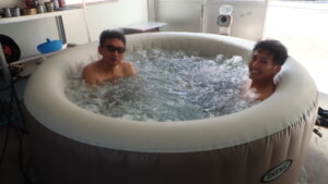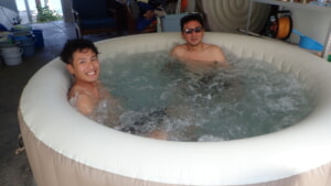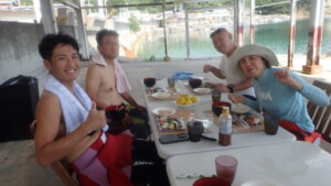 ボートの上で、FUNのセンセーと、OWのきーたんは同じ様な格好、
