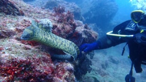 ユウさんは、おっかなびっくりウツボに近づいて