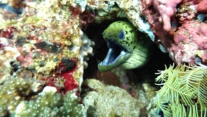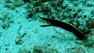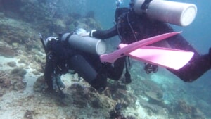 ウツボ好きな外人ガイドのフィンを引っ張って、何千本も潜ってる地元ガイドに
